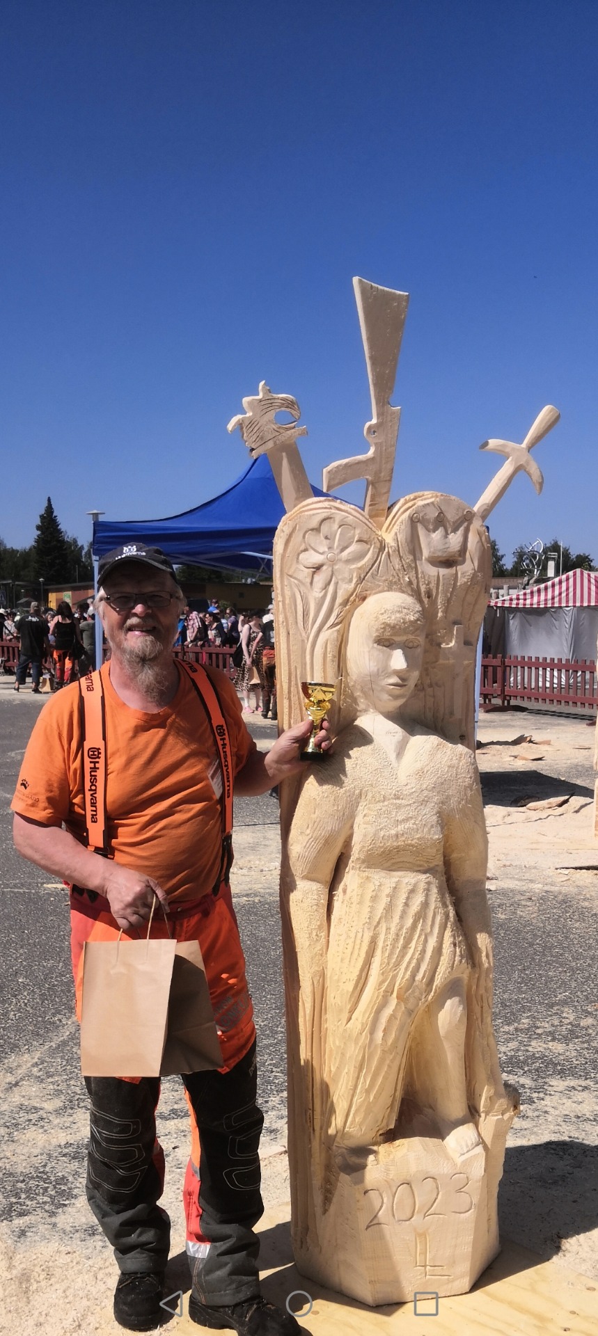 Veistoksissa käytän etupäässä sähkösahoja, sähkötyökaluja ja sähkövirta tulee aurinkopaneeleista. Sahoissa käytän eko-teräketjuöljyä.